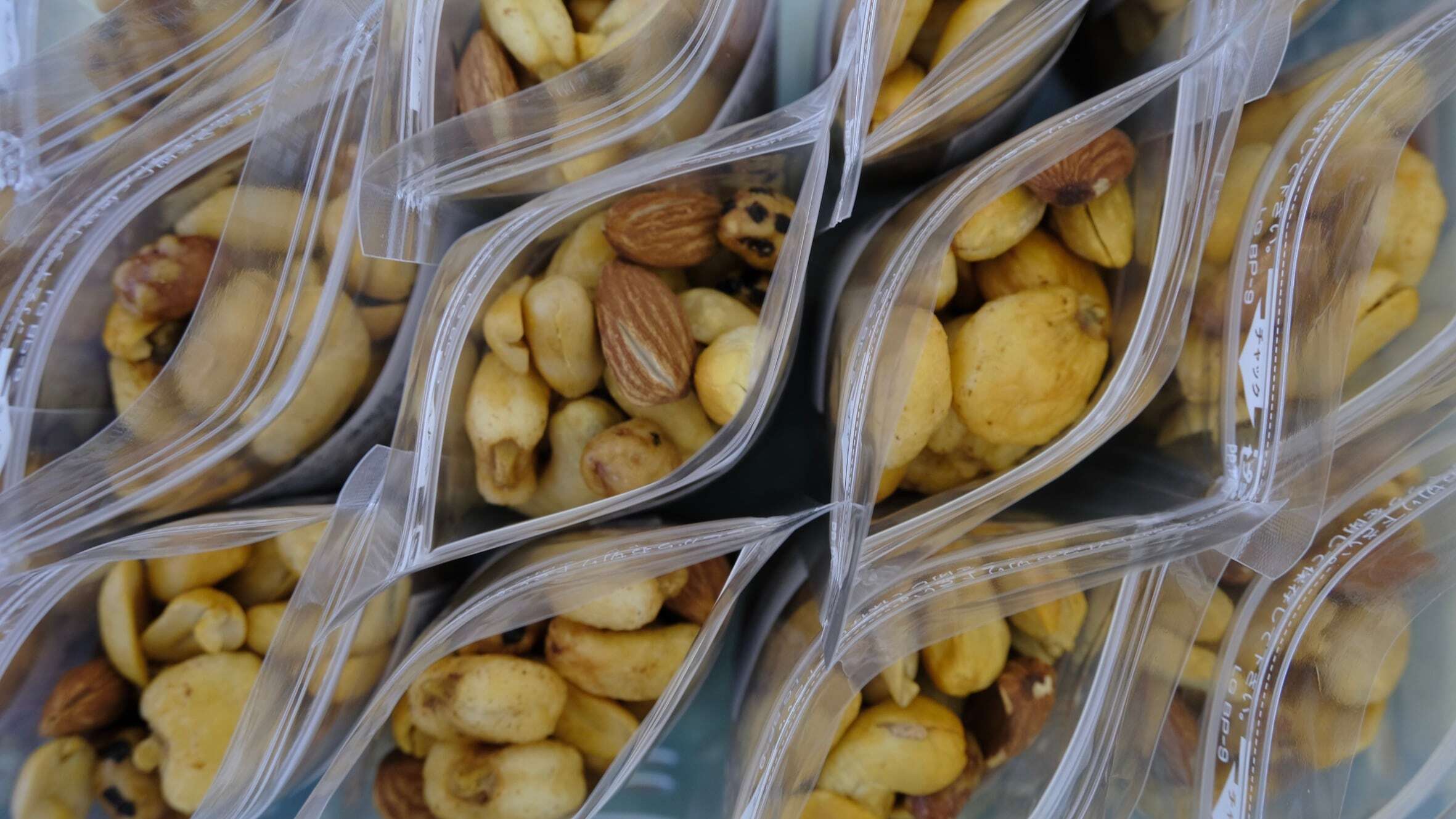 ピーナッツ(落花生(中国産)、植物油脂、食塩)、ジャイアントコーン(ジャイアントコーン、植物油、食塩、こしょう)、アーモンド、衣ピーナッツ(落花生、小麦粉、醤油加工品(醤油、砂糖、その他)、砂糖、寒梅粉ミックス(澱粉、米粉)、澱粉、植物油、海苔)、カシューナッツ/加工澱粉、調味料(アミノ酸等)、着色料(カラメル)、甘味料(カンゾウ)、香料、(一部に落花生・小麦・カシューナッツ・アーモンド・大豆を含む)
